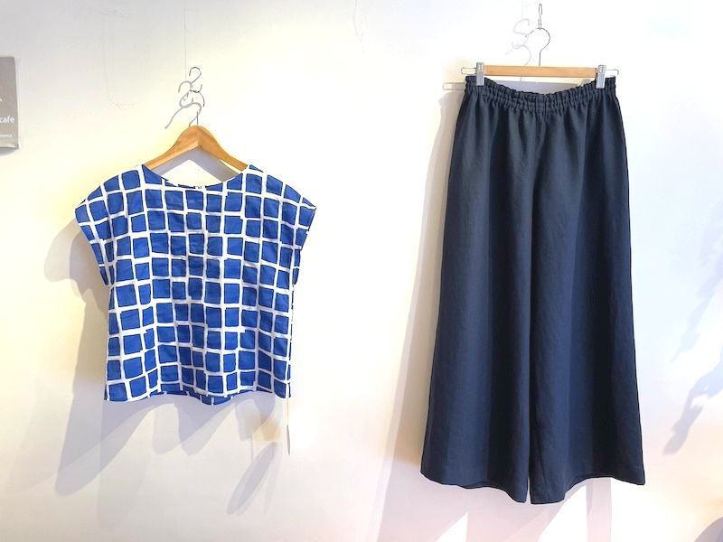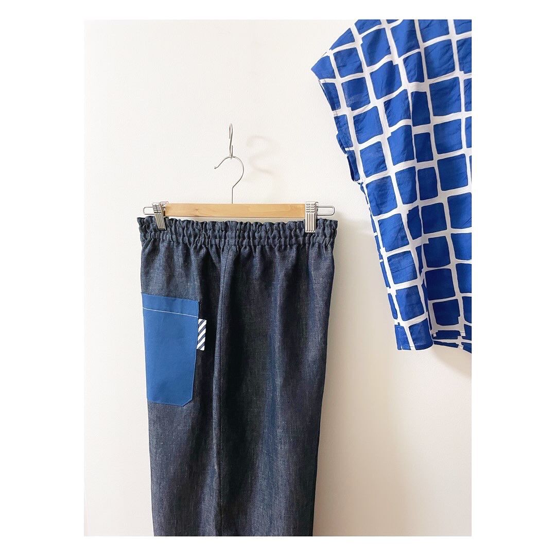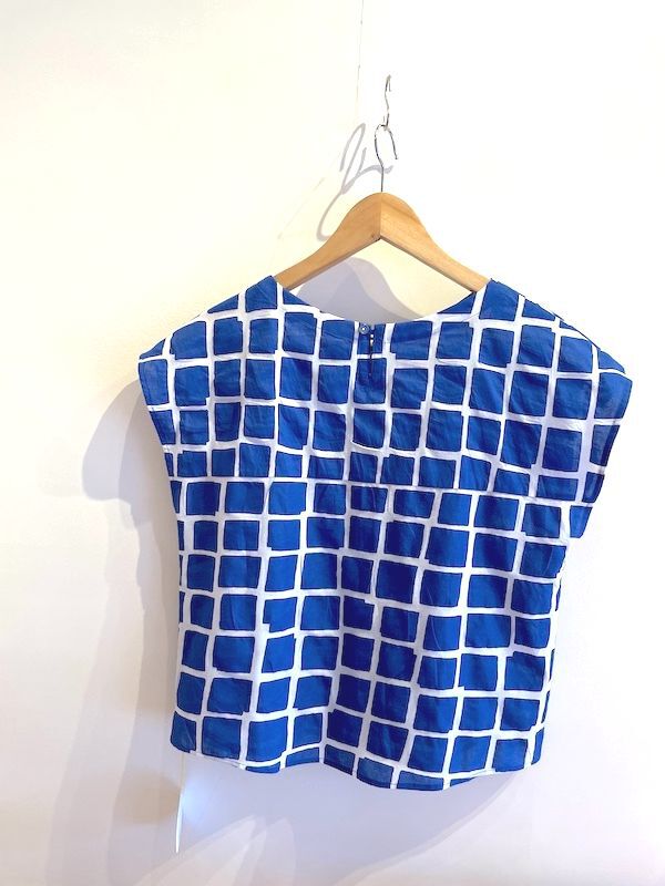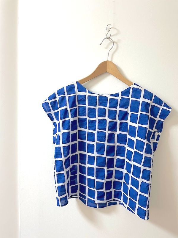 青のスクエア柄のコットン生地で
